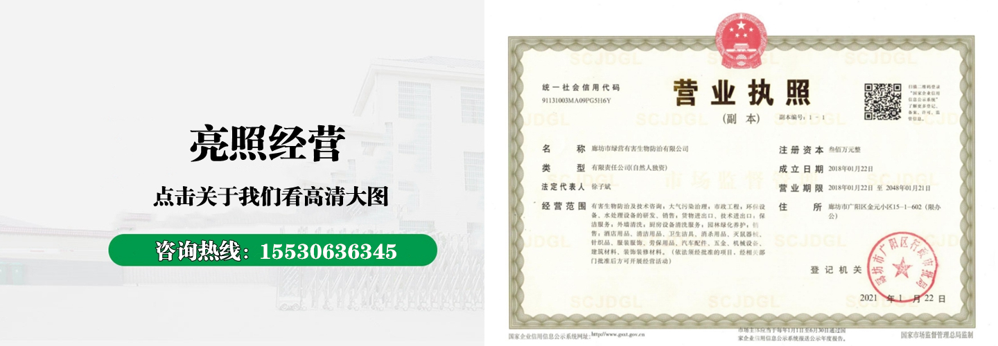 廊坊市綠營有害生物防治有限公司從事新建、改建、擴建房屋的白蟻預防和滅治工程及家居有害生物綜合治理工程(包括滅白蟻、滅老鼠、滅蟑螂、滅蚊蠅、滅螞蟻、滅跳蚤、滅蛀蟲、滅臭蟲、殺螨蟲、殺蜈蚣、殺蜘蛛、殺潮蟲、殺野蜂,殺衣魚、殺千足蟲、驅蛇防蛇等);針對室內外的白蟻及各種害蟲防治具有多年的實踐經驗...